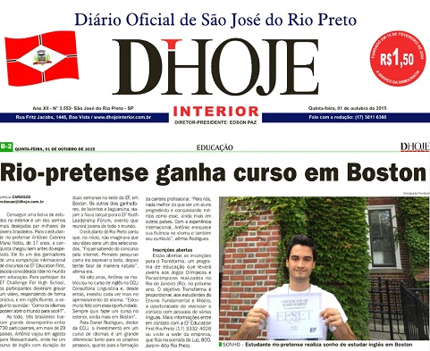 Estudante Antônio Cabrera Mano Netto, de 17 anos, foi destaque no EF Challenge For High School ao gravar um vídeo sobre a importância da fluência em um segundo idioma. Essa notícia do aluno da CCLi foi destaque no jornal DHoje e no site Região Noroeste.