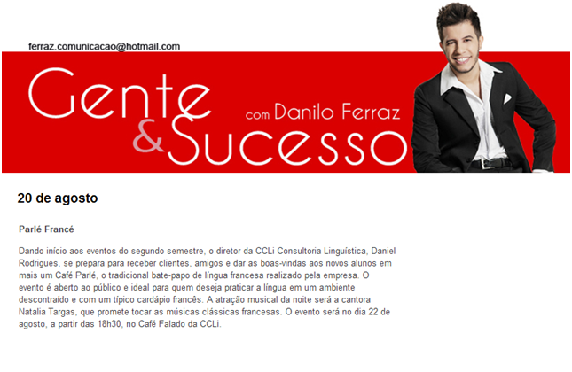 O Café Parlé, o tradicional bate-papo de língua francesa da CCLi, foi destaque na coluna Gente & Sucesso do jornal DHoje, blog da Malu Rodrigues e na coluna da Cida Caran.